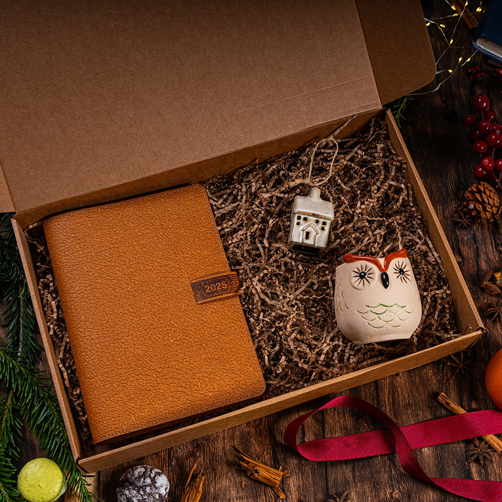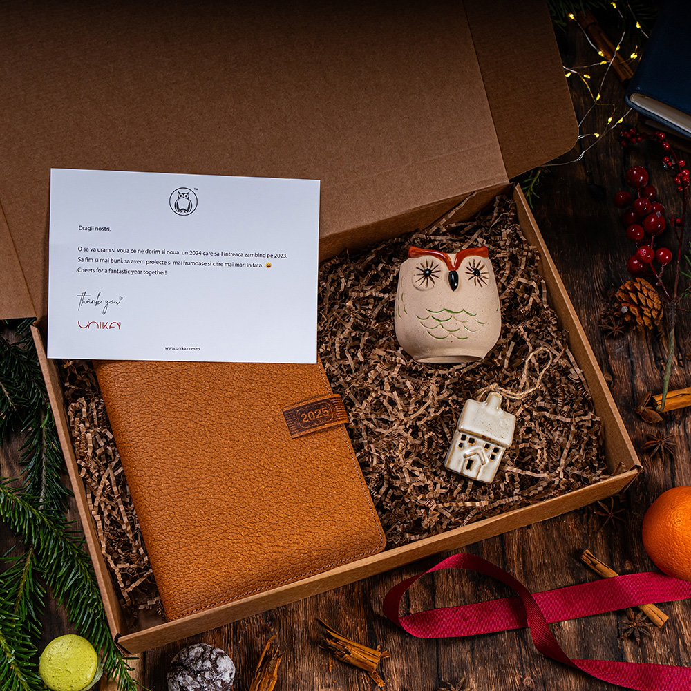 Another Christmas food and drink basket received or gifted this year? Not this time. Not when you can choose, within an extra-friendly budget :), a superb, practical, and timeless set that you can customize exactly according to your brand’s needs: from a logo on the agenda to a message on the box, to the color of the ribbon tying the box – with unlimited possibilities. * The photos are for presentation purposes only.